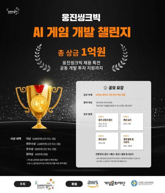 심사는 예선심사와 본선심사로 진행된다. 웅진씽크빅은 ▲독창성 ▲재미 ▲아이디어 완성도 ▲상용화 가능성 등을 중심으로 평가할 계획이다. 본선에 진출한 30개 팀에는 게임 개발을 위해 웅진씽크빅의 AI 학습 데이터와 아마존웹서비스(AWS) 클라우드 컴퓨팅 서비스를 제공한다.