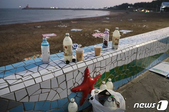 (제주=뉴스1) 오현지 기자 = 2일 오전 제주시 이호해수욕장에 밤사이 사람들이 버리고 간 쓰레기들이 쌓여 있다. 2021.10.2/뉴스1