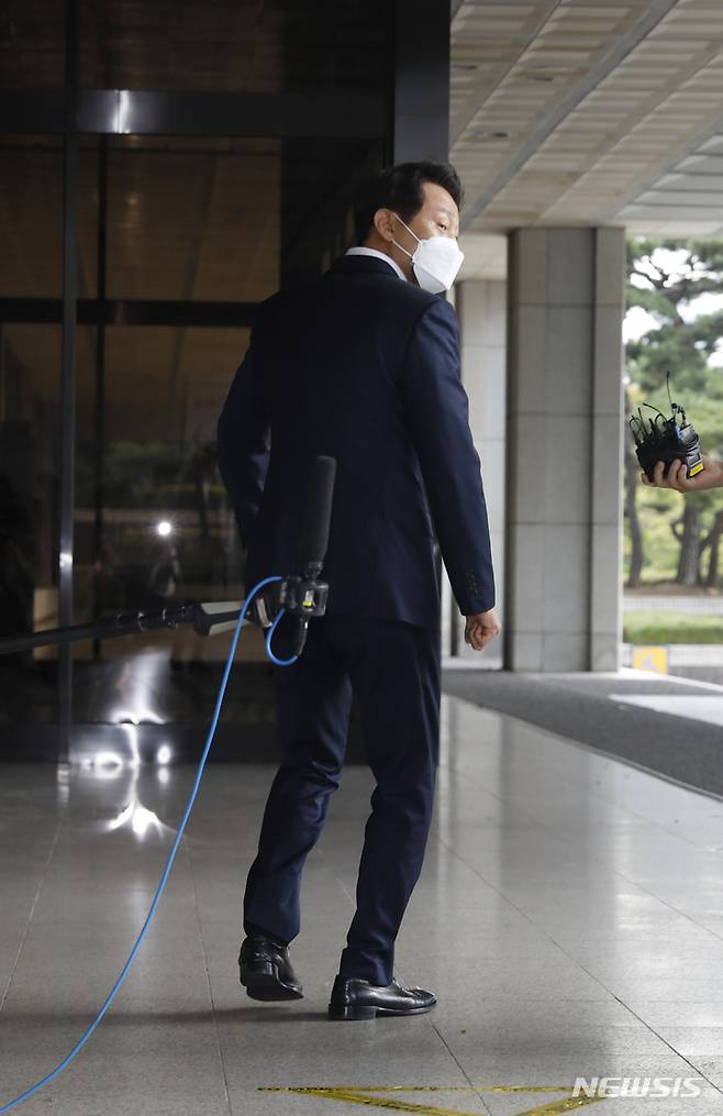 [서울=뉴시스] 고승민 기자 = 파이시티 관련 허위사실 유포 혐의(공직선거법 위반)을 받는 오세훈 서울시장이 피의자 신분으로 조사를 받기 위해 2일 서울중앙지방검찰청으로 출석, 취재진 질문에 답한 후 출입문 반대 방향으로 가려다 다시 몸을 돌리고 있다. 파이시티 의혹은 서울 양재동 부근 약 3만평 가량의 대지 위에 백화점과 업무 시설 등을 건설하는 복합유통센터 개발을 허가하는 과정에서 각종 특혜비리 의혹이 불거진 사건이다. 오 시장은 보궐선거 후보로 나섰던 한 토론회에서 이 사건과 관련해 "제가 재직하던 시절에 서울시와 관계되는 사건은 아닐 것이다. 제 임기 중 인허가한 사건은 아닌 것 같다"는 발언으로 한 시민단체로부터 공직선거법상 허위사실 공표 혐의로 고발된 바 있다. 2021.10.02. kkssmm99@newsis.com