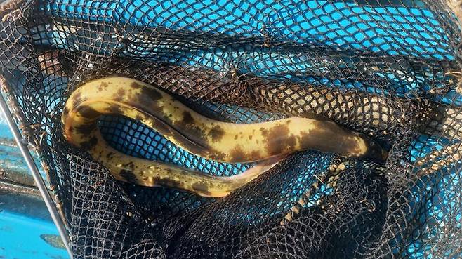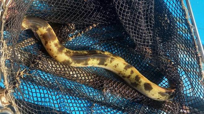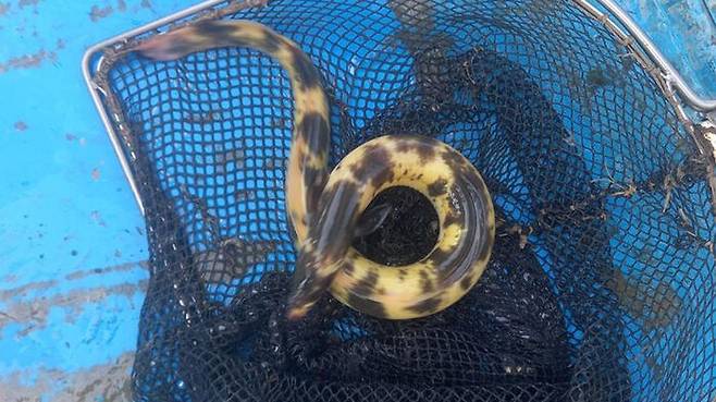 어제(1일) 경기 고양시 부근 한강에서 몸통이 황금빛을 띠고 검은색 반점이 있는 뱀장어가 잡혔습니다.
