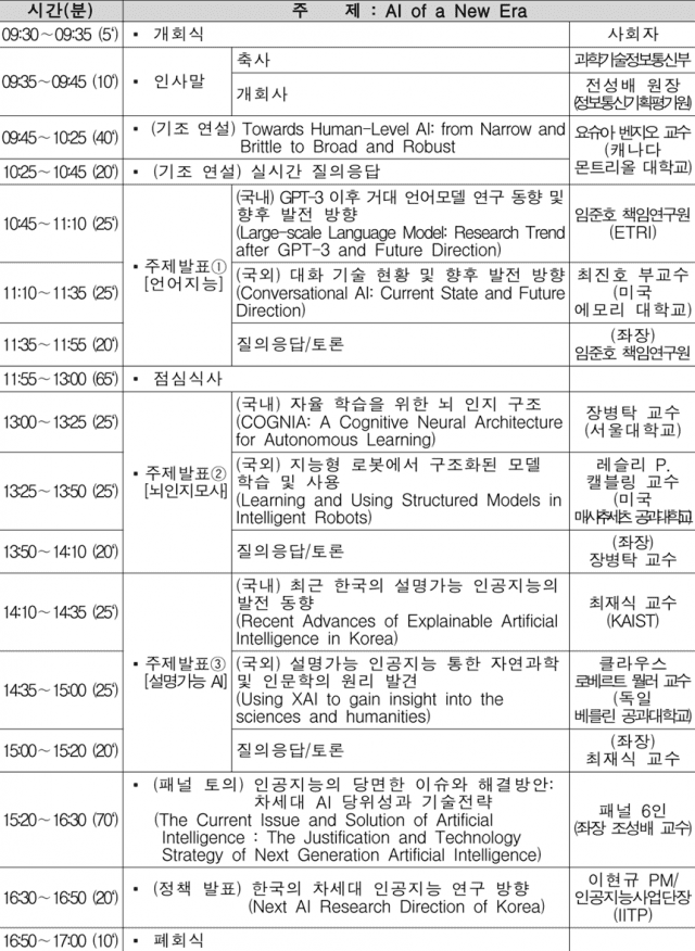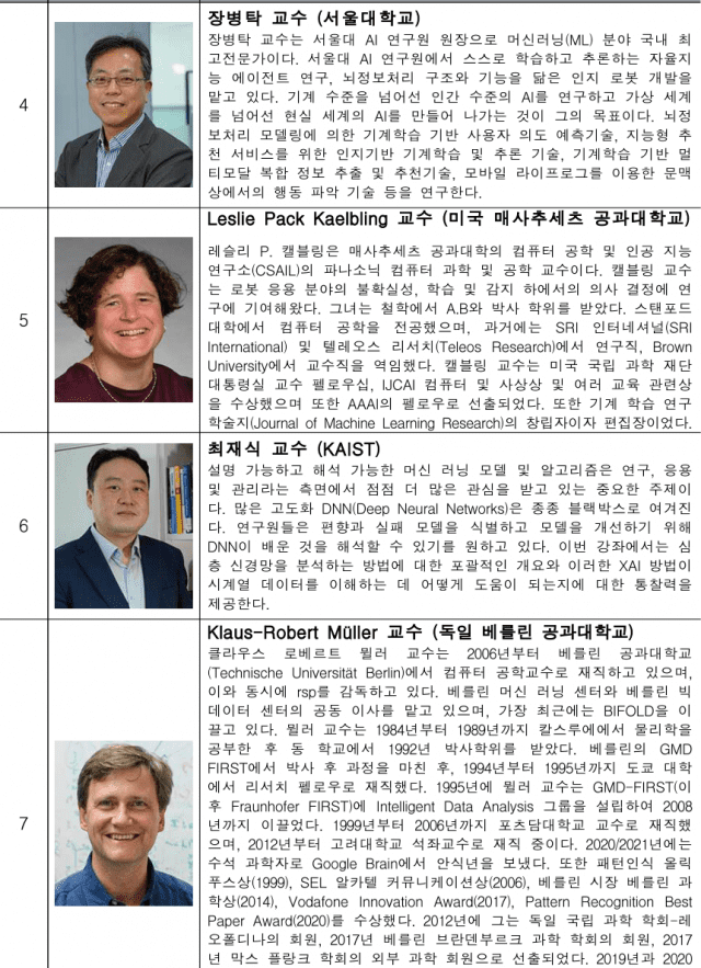 요슈아 벤지오 교수를 비롯해 한국과 미국, 독일에서 활동하는 저명한 AI학자들이 강사로 나선다. 또 이현규 IITP 인공지능사업단장 겸 과기정통부 PM이 '한국의 차세대 인공지능 연구 방향'도 소개한다.