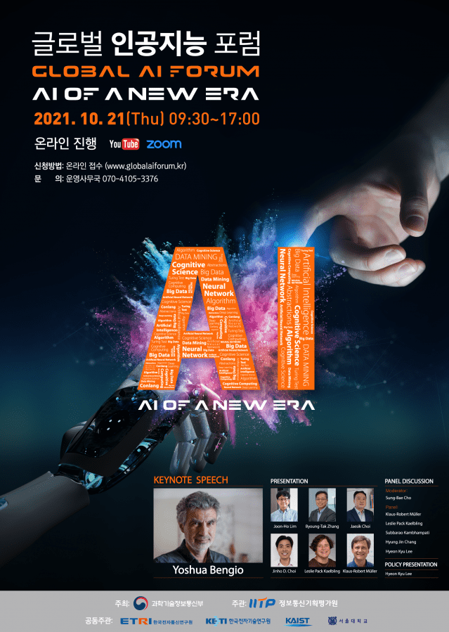 '새로운 시대의 AI(AI of a New Era)'를 주제로 열리는 이 행사는 세계가 주목하는 인공지능 기술의 미래 발전 방향을 제시, 향후 연구 방향과 산업 및 사회 전 분야에 AI를 활용, 확산할 수 있는 전략 모색을 위해 마련됐다. 동시통역으로 진행되며 온라인으로 누구나 무료로 들을 수 있다. 유튜브에서 '글로벌 인공지능 포럼'을 검색하거나 줌 시청은 행사 홈페이지에서 사전 등록하면 접속 링크를 보내준다.