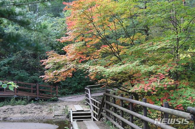 [횡성=뉴시스] 이덕화 기자 = 2일 강원 횡성군의 청태산과 태기산 자락에 자리잡은 국립횡성숲체원에 울긋불긋한 단풍이 하나 둘 고개를 들고 있다. 산림청이 발표한 올해 단풍 절정 시기는 10월 하순경으로 예상된다. 숲체원은 한국산림복지진흥원에서 운영하는 산림교육전문 휴양시설로 도시인에게 숲과 나무에 대한 체계적인 교육을 받을 수 있는 장소와 프로그램을 제공하고 있다. 2021.10.02. wonder8768@newsis.com