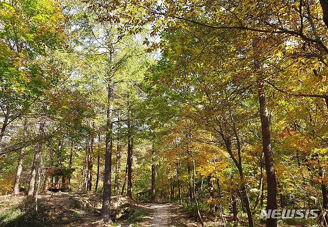 [횡성=뉴시스] 이덕화 기자 = 2일 강원 횡성군의 청태산과 태기산 자락에 자리잡은 국립횡성숲체원에 울긋불긋한 단풍이 하나 둘 고개를 들고 있다. 산림청이 발표한 올해 단풍 절정 시기는 10월 하순경으로 예상된다. 숲체원은 한국산림복지진흥원에서 운영하는 산림교육전문 휴양시설로 도시인에게 숲과 나무에 대한 체계적인 교육을 받을 수 있는 장소와 프로그램을 제공하고 있다. 2021.10.02. wonder8768@newsis.com