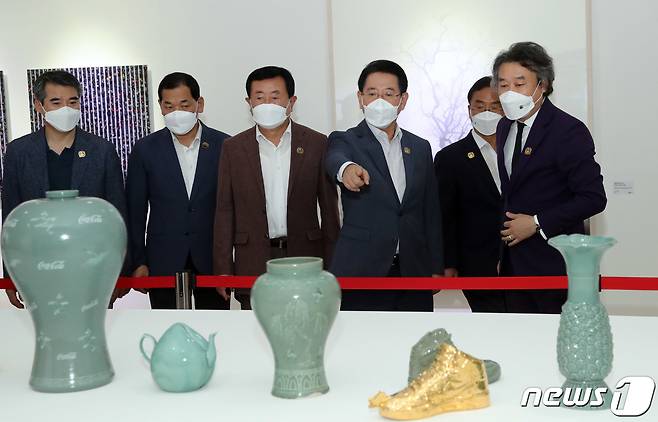 (진도=뉴스1) 전원 기자 = 김영록 전라남도지사가 2일 진도 운림산방을 방문, 2021 전남국제수묵비엔날레 전시작품을 관람하고 있다.(전남도 제공) 2021.10.2/뉴스1