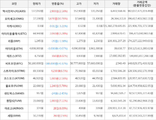 또한, 아르고(8.09%, 374원), 테조스(8.02%, 8,750원), 퀀텀(7.11%, 15,060원), 스트라이크(6.5%, 69,330원), 플로우(5.78%, 22,680원), 이더리움클래식(3.28%, 64,940원), 세럼(2.6%, 10,270원), 코스모스(2.18%, 46,920원), 엑시인피니티(2.16%, 137,050원)가 상승세를 나타냈다.