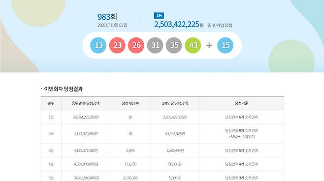 983회 동행복권 로또 추첨 결과 13, 23, 26, 31, 35, 43이 1등 당첨번호로 결정됐다. 2등 보너스 번호는 15이다.