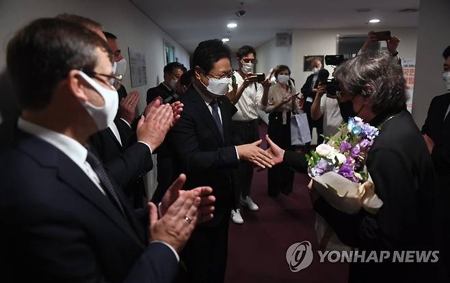 (서울=연합뉴스) 황희 문화체육관광부 장관이 2일 서울 서초구 예술의전당에서 한러문화상호교류의 해 기념행사로 열린 러시아 시즌 개막공연에서 참석해 공연을 마친 출연진을 격려하고 있다. 2021.10.2 [문화체육관광부 제공. 재판매 및 DB금지]