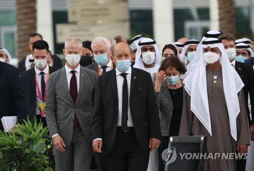 epa09501799 Sheikh Nahyan bin Mubarak Al Nahyan (R) , Minister of Tolerance and Coexistence arrives with French Foreign Minister Jean-Yves Le Drian (C) to attend a ceremony at the EXPO site on the occasion of the French Day during the second day of of EXPO 2020 Dubai in Gulf emirate of Dubai, United Arab Emirates on 02 October 2021. 192 countries take part with their pavilions in the EXPO 2020 Dubai which is the first international Expo to be held in the Middle East, Africa and South Asia (MEASA) region running between 01 October 2021 and 31 March 2022. EPA/ALI HAIDER