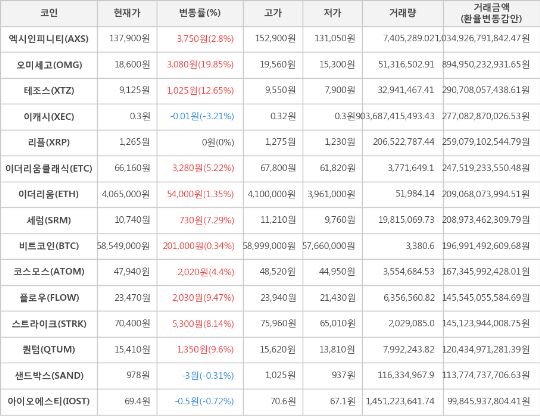가상화폐 비트코인 0.34% 상승, 오미세고 19.85% 상승
