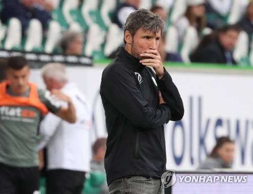 epa09501900 Wolfsburg's head coach Mark van Bommel reacts during the German Bundesliga soccer match between VfL Wolfsburg and Borussia Moenchengladbach in Wolfsburg, northern Germany, 02 October 2021. EPA/FOCKE STRANGMANN CONDITIONS - ATTENTION: The DFL regulations prohibit any use of photographs as image sequences and/or quasi-video.