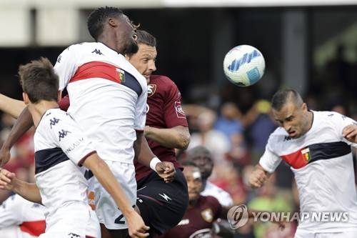 Salernitana's Milan Djuric scores during the Serie A soccer match between Salernitana and Genoa, at the Arechi stadium in Salerno, Italy, Saturday, Oct. 2, 2021. (Alessandro Garofalo/LaPresse via AP) ITALY OUT;