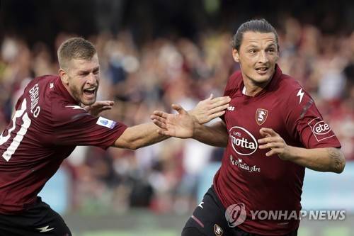 Salernitana's Milan Djuric, right, celebrates scoring during the Serie A soccer match between Salernitana and Genoa, at the Arechi stadium in Salerno, Italy, Saturday, Oct. 2, 2021. (Alessandro Garofalo/LaPresse via AP) ITALY OUT;