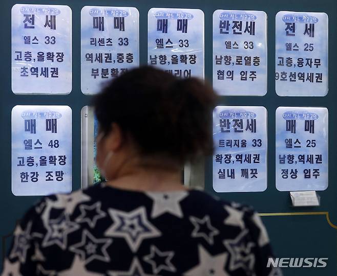 서울 아파트의 전세난이 지속되면서 지난 8월 반전세 등 월세를 낀 임대차 거래가 올 들어 처음으로 40%를 넘긴 것으로 조사된 가운데 서울 송파구 한 상가 부동산 밀집 지역에 반전세 등 정보 안내문이 부착돼 있다.