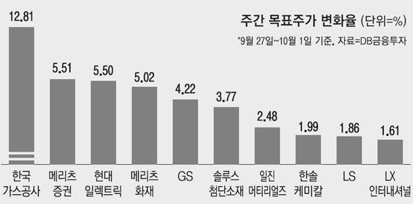 지난주 증권사들의 목표주가 상향폭이 가장 컸던 종목은 한국가스공사였다. 수소 사업에 진출하겠다는 계획이 긍정적으로 작용했다. 메리츠증권은 한국가스공사 목표주가를 5만1000원으로 기존 대비 11% 상향 조정했다. 유진투자증권도 한국가스공사 목표주가를 6만원으로 67% 올려 잡았다. 황성현 유진투자증권 연구원은 "천연가스 도매사업은 실적 변동성이 낮고 추가 투자 규모가 크지 않아 연 1조원의 안정적인 이익 수준을 유지할 전망"이라고 설명했다.