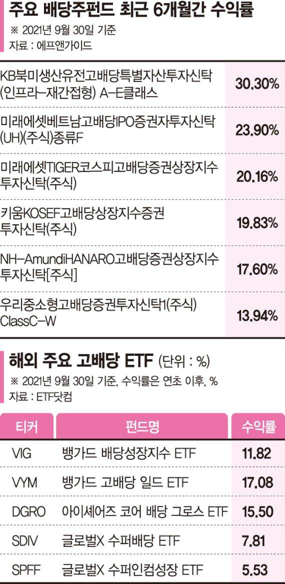 금융정보업체 에프앤가이드에 따르면 최근 6개월간(9월 30일 기준) 배당주 펀드에 4617억원의 투자자금이 몰렸다. 이 기간 수익률 상위 5개 상품이 모두 고배당 펀드였다.