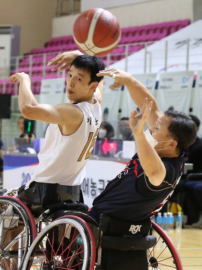 [서울=뉴시스] 김병문 기자 = 3일 오후 강원 춘천시 호반체육관에서 열린 ‘2021 KWBL 휠체어농구리그’ 사흘째 서울특별시청과 고양 홀트의 경기에서 고양 황정희(오른쪽)가 서울 이윤주를 피해 패스를 시도하고 있다. (사진=한국휠체어농구연맹 제공) 2021.10.03. photo@newsis.com *재판매 및 DB 금지