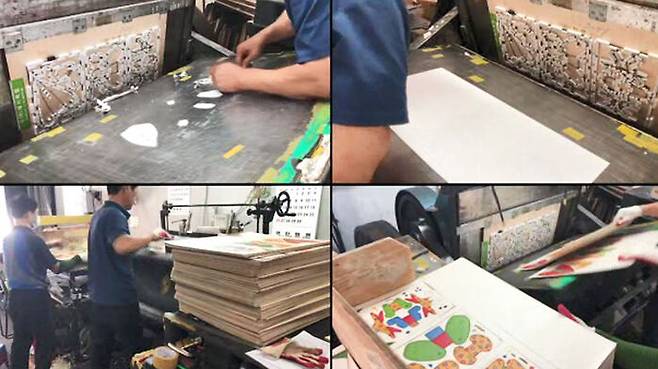 종이에 알록달록 밑그림이 입혀지고 여러 장을 압착해서,