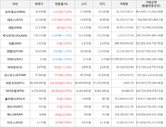 또한, 왁스(13.54%, 369원), 아이콘(12.18%, 2,670원), 이오스(9.48%, 5,775원), 오미세고(7.62%, 20,490원), 세럼(5.7%, 11,130원), 폴리매쓰(5.48%, 962원), 리플(3.95%, 1,315원), 헌트(3.55%, 933원), 코스모스(1.42%, 47,960원), 이더리움(0.97%, 4,174,000원)이 상승세를 나타냈다.