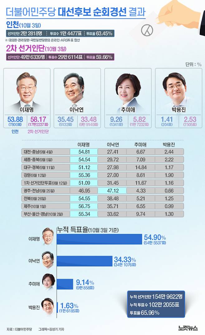 이재명 지사는 3일 인천 지역 경선에서 53.8%의 득표율로 1위를 차지했다.