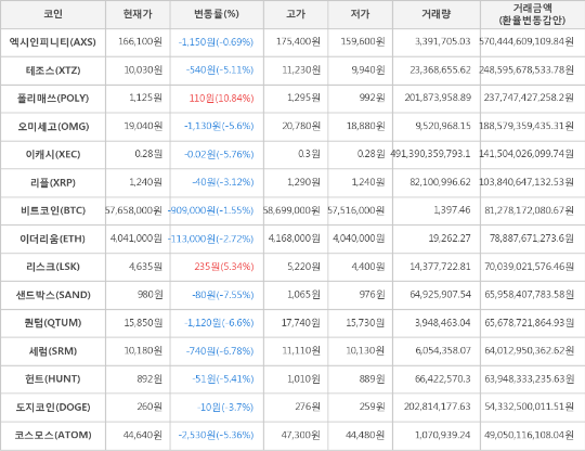 또한, 세럼(-6.78%, 10,180원), 퀀텀(-6.6%, 15,850원), 이캐시(-5.76%, 0.28원), 오미세고(-5.6%, 19,040원), 헌트(-5.41%, 892원), 코스모스(-5.36%, 44,640원), 테조스(-5.11%, 10,030원), 도지코인(-3.7%, 260원), 리플(-3.12%, 1,240원), 이더리움(-2.72%, 4,041,000원), 엑시인피니티(-0.69%, 166,100원)가 하락세를 나타냈다.