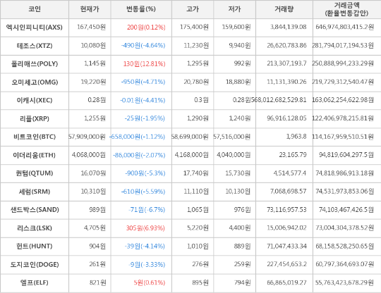 [표]가상화폐 시세 (제공: 암호화폐 거래소 업비트)