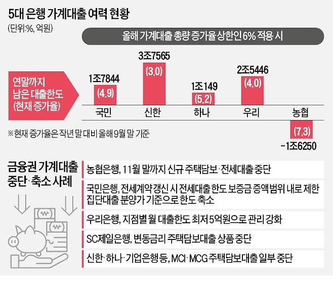 은행별로 보면 이미 신규 주택대출을 중단한 농협은행의 대출 증가율이 7.3%로 가장 높았고 하나은행이 5.2%, 국민은행이 4.9% 순이었다. 우리은행과 신한은행은 각각 4%, 3%로 비교적 여유가 있지만 우리은행이 선제적으로 한도 관리에 들어가면서 다른 은행들도 이에 준하는 강력한 대출 제한에 나설 수밖에 없을 것이란 관측이 나온다. 이미 SC제일은행은 이달 7일부터 변동금리 주택담보대출 상품, 카카오뱅크는 마이너스통장 대출 중단을 결정했다. 한 시중은행 관계자는 “앞서 대출을 중단하거나 제한한 은행들의 풍선 효과도 아직 본격적으로 반영되지 않은 상태”라며 “12월에 대출 ‘셧다운’을 겪지 않으려면 줄줄이 한도를 대폭 줄이고 금리를 추가로 올리는 등 대출 문턱을 더 높일 수밖에 없을 것”이라고 내다봤다.