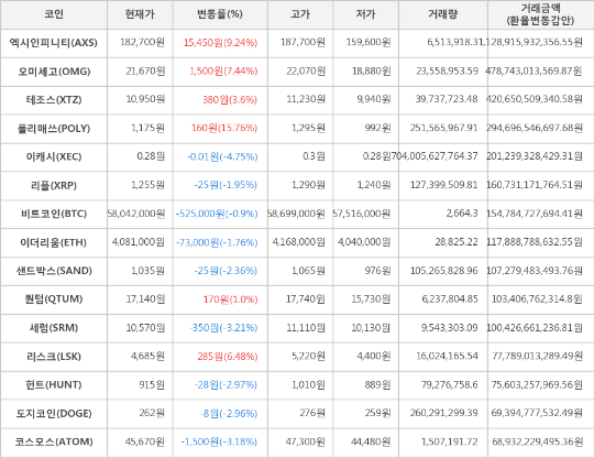 또한, 엑시인피니티(9.24%, 182,700원), 오미세고(7.44%, 21,670원), 리스크(6.48%, 4,685원), 테조스(3.6%, 10,950원), 퀀텀(1.0%, 17,140원)이 상승세를 나타냈다.