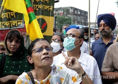 epa09505708 Left party and farmers organisations jointly march a mass protest as they shout against the Indian Government on the issue of farmers killing in Uttar pradesh in Kolkata, Eastern India, 04 October 2021. Eight people including four farmers were killed in Uttar Pradesh after violence broke out during the visit of Union Minister and Deputy Chief Minister Keshav Mayura as the farmers tried to stop the visit of the Minister. EPA/PIYAL ADHIKARY