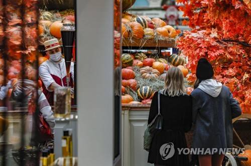 epa09505704 A vendor wearing a protective face mask sells lemonade in front of a fountain decorated with pumpkins at the State Department store GUM in Moscow, Russia 04 October 2021. Russia is facing a new wave of Covid-19 infections, with additional 883 coronavirus-related deaths reported on 04 October bringing the official coronavirus death toll to 210 801. EPA/YURI KOCHETKOV