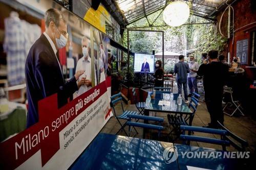 epa09505713 People wait for the outcome of the municipal election inside the electoral committee of center-left outgoing Milan Mayor and mayoral candidate Giuseppe Sala, in Milan, Italy, 04 october 2021. Rome, Milan, Naples, Turin and Bologna held municipal elections to elect new mayors and city councils on 03 and 04 October. EPA/MOURAD BALTI TOUATI