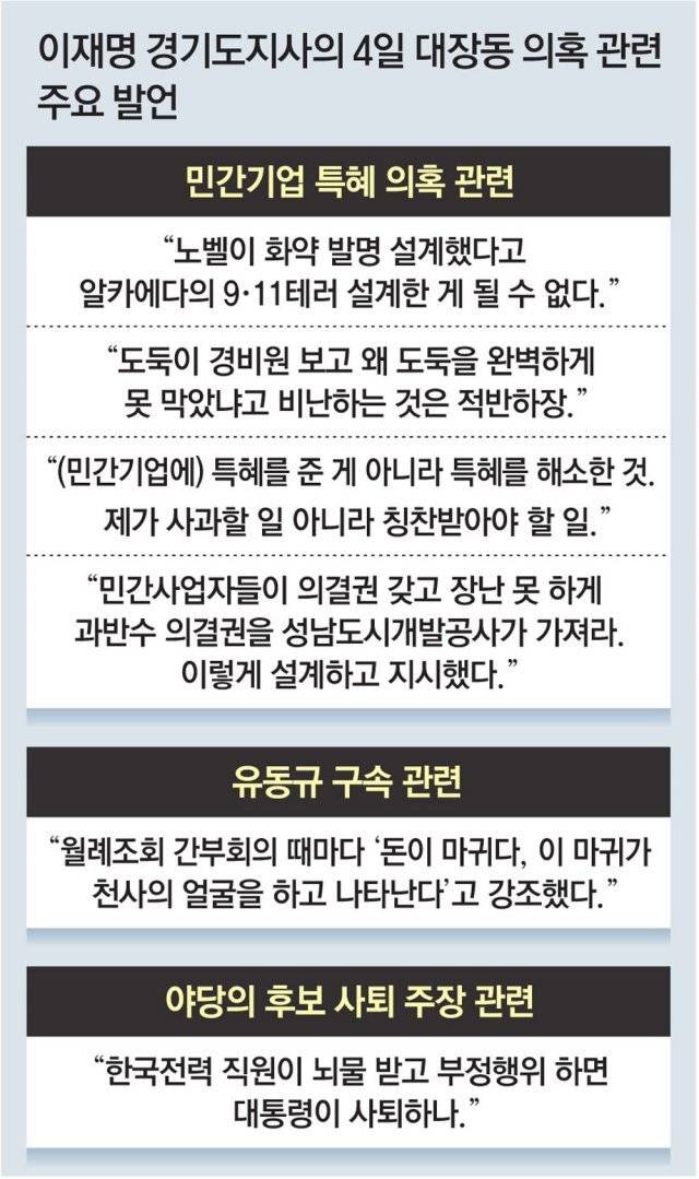 이날 그는 “성남시 공무원과 산하기관 임직원에 대한 관리 책임은 당시 성남시장이던 제게 있는 게 맞다”며 “(비리가 있는지) 살피고 또 살폈지만 그래도 부족했던 것 같다”고 했다. 그는 “성남시장부터 지금까지 공직사회를 향해 항상 ‘부패지옥 청렴천국, 부패즉사 청렴영생’을 강조했다”며 “월례조회 간부회의 때도 ‘돈이 마귀다. 이 마귀가 천사의 얼굴을 하고 나타난다. 그땐 그 마귀의 노예가 된다’고 했다”고도 했다.