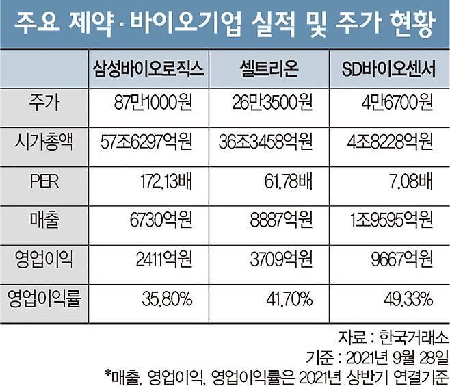 중소기업 디스카운트 현상과 관련, 삼성바이오로직스와 셀트리온의 경우 업종은 다르지만 코로나 특수를 누렸다는 점에서 SD바이오센서와 공통점이 있다. 백신 위탁생산(CMO)을 맡은 삼성바이오로직스와 코로나 치료제를 개발 중인 셀트리온은 실적에 비해 주가가 고평가됐다는 분석이 있다. 올 상반기 삼성바이오로직스와 셀트리온은 각각 매출 6730억원, 8887억원을 기록했고 영업이익률도 35~40%대 수준을 달성했다.