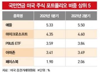 국민연금은 미국 주식을 대량 매수한 것으로 나타났다. 국민연금이 미국 증권거래위원회(SEC)에 제출한 주식 현황 보고서(13 Form) 등에 따르면 국민연금의 지난 6월 말 기준 미국 상장사 주식 평가액은 526억4200만 달러(약 62조4861억원)로 지난해 말 438억6200만 달러(약 52조642억원) 대비 20.01% 증가했다. 미국 주식을 1억 달러 이상 보유한 기관투자가는 매 분기가 마무리된 후 45일 이내에 보유 주식 현황 보고서를 SEC에 보고해야 한다.