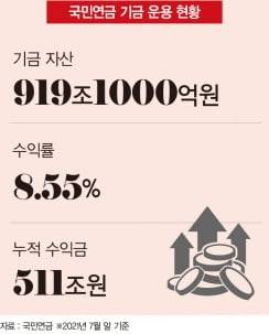 미래의 ‘밥줄’인 기금 운용 수익률은 최근 가파르게 상승하고 있다. 2012년부터 2018년까지 7년간 연평균 4.58%의 수익률을 내던 국민연금은 2019년 설립 후 최고치(11.31%)를 기록했다. 2020년엔 신종 코로나바이러스 감염증(코로나19) 사태라는 악재 속에서도 9.70%의 수익률을 올렸다. 2021년 7월 말 기준 수익률은 8.55%다. 한동안 500조~600조원을 맴돌던 운용 자금은 수익률이 상승세를 타며 2019년 700조원, 2020년 800조원, 2021년 상반기 900조원을 돌파했다.