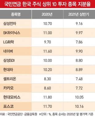 실제 분석 결과 국민연금은 지난해 투자 종목 상위 10개사의 비율을 모두 낮췄다. 국민연금 한국 주식 중 가장 높은 비율을 차지했던 삼성전자는 지난해 말 10.7%에서 올해 상반기 9.16%로 낮아졌다. 같은 기간 SK하이닉스는 11.0%→9.97%, LG화학은 9.7%→7.86%, 네이버는 11.6%→9.9%, 삼성SDI는 10.0%→8.80%, 현대차는 10.2%→8.89%, 셀트리온은 8.3%→7.48%, 카카오는 8.6%→7.72%, 현대모비스는 11.8%→10.05%, 포스코는 11.7%→10.16%로 지분을 축소했다.