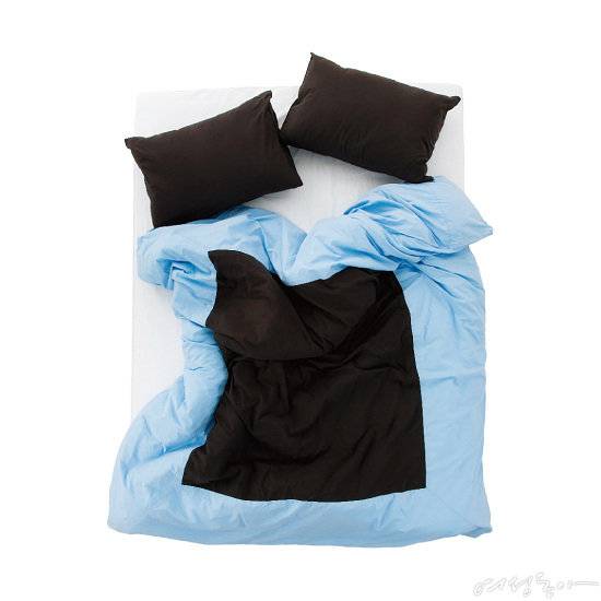 이불 한가운데 패치워크를 더해 '바다 위의 섬’을 형상화했다. 블랙과 블루 컬러 조합이 세련된 느낌. 탄탄한 조직감과 소프트한 터치감이 특징인 면 60수 고밀도 평직 원단을 사용했다.