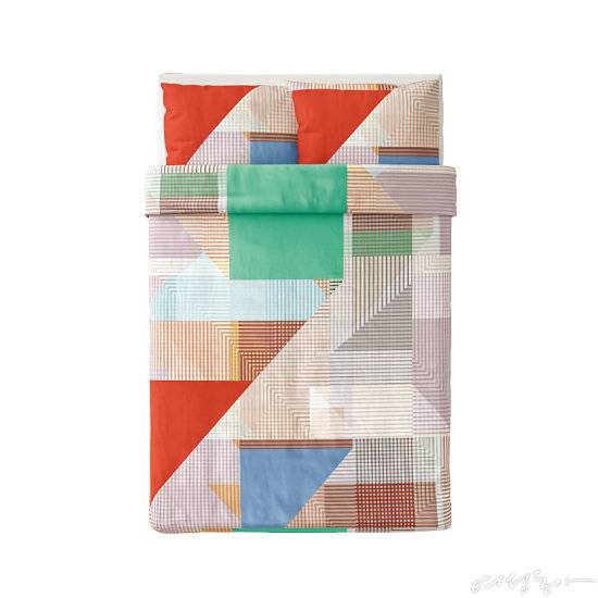 다양한 크기의 선과 면, 비비드 컬러의 조합이 발랄한 느낌을 자아내는 침구 세트. 면, 비스코스 레이온 등의 원단으로 제작해 공기가 잘 통하는 것은 물론 땀 흡수율도 높아 쾌적한 잠자리를 제공한다.
