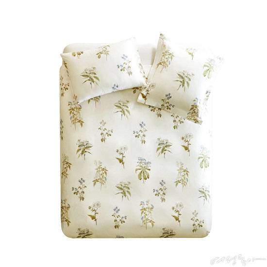 프로방스 어느 가정집에 있을 법한 보태니컬 패턴이 돋보이는 300TC 새틴 면 소재 이불 커버. 톤 다운된 컬러와 잔잔한 꽃과 가지 프린트가 편안한 분위기를 자아낸다.