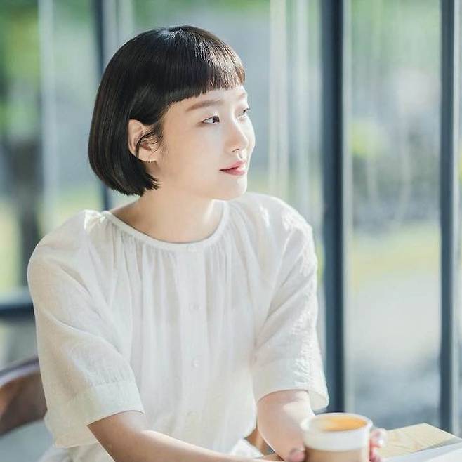 얼굴이 환해보이는 화이트 원피스. 네크라인에 셔링이 잡혀 있어 사랑스러움을 더해주는 디자인이에요. 유미는 여기에 브라운 톤의 백을 매치해 따뜻한 느낌으로 스타일링 했네요.