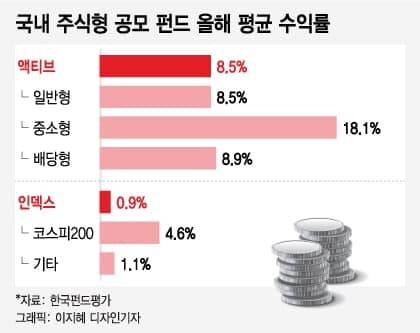 반면 국내 주식형 액티브 펀드의 올해 평균 수익률은 8.5%(한국펀드평가 기준)다. 중소형주식형은 18.1%, 배당주식형은 8.9%를 기록하고 있다. 반면 코스피200 인덱스형(4.56%)의 두배다.