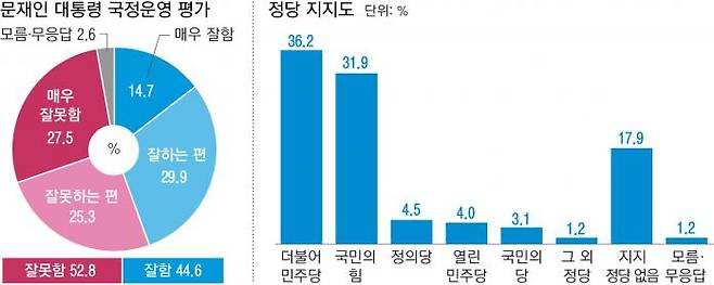 문재인 대통령의 국정운영에 대한 부정 평가가 52.8%로, 긍정 평가(44.6%)보다 높게 나타났다. 정당별 지지도는 더불어민주당이 36.2%로 국민의힘(31.9%)을 앞섰다.