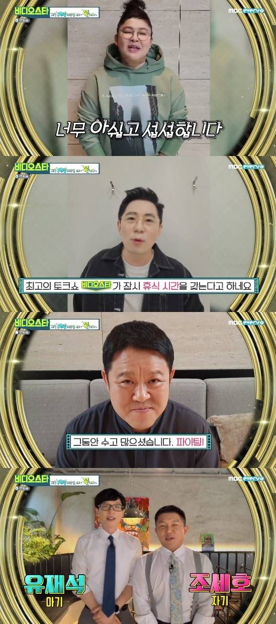 또 김구라는 "'라디오스타'의 자매 프로그램이라고해서 축하인사를 했던 기억이 난다. '라디오스타'가 오빠 프로그램으로서 최선을 다해 더 열심히 하겠다"고 했고, 유재석도 "'비디오스타'가 잠시 떠난다니 아쉽다. 한 프로그램을 오래한다는 건 정말 어려운 일이다. 언젠가는 돌아올 그 날을 기다려본다. 덕분에 즐거웠다. 꼭 돌아와달라"고 바람을 전했다.