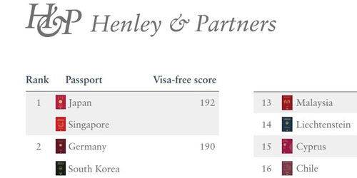 공동 1위는 일본과 싱가포르로 두 나라 국민은 전 세계 193개국을 무비자 또는 사실상 무비자로 여행할 수 있는 것으로 나타났습니다.