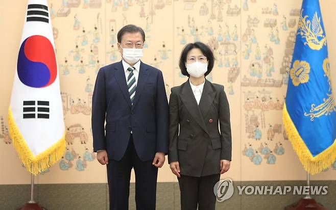 (서울=연합뉴스) 최재구 기자 = 문재인 대통령이 6일 오전 청와대 본관에서 오경미 신임 대법관에게 임명장을 수여하고 기념촬영을 하고 있다. 2021.10.6