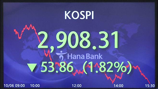 오늘 코스피는 전날보다 53.86포인트(1.82%) 급락한 2,908.31에 마감했습니다.