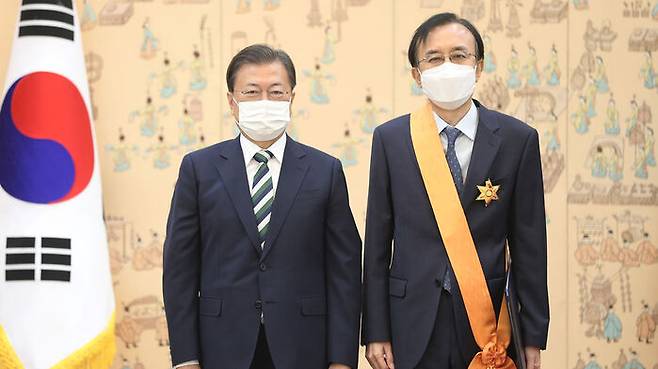 문 대통령은 아울러 오 대법관의 전임자인 이기택 전 대법관에게 청조근정훈장을 수여했습니다.