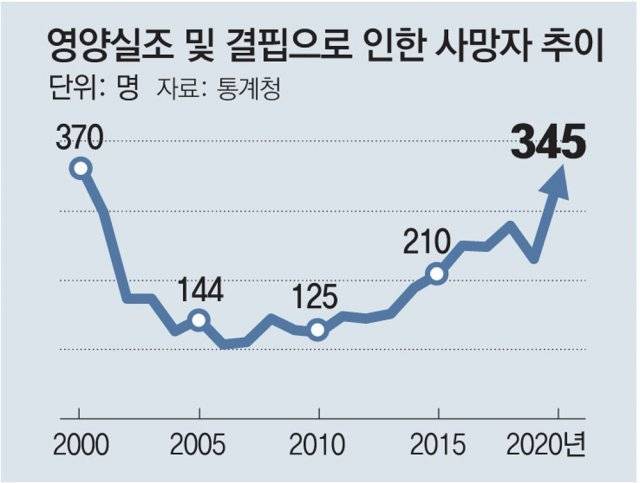 코로나19가 2년 가까이 이어지면서 우리 사회의 극빈층과 소외계층이 말 그대로 생존의 위협에 직면해 있다. 이 과정에서 현 복지제도의 허술함이 드러나고 있다. 6일 동아일보가 통계청 자료를 분석한 결과 2020년 영양실조와 영양결핍으로 숨진 사람은 345명이었다. 코로나19 유행 전인 2019년(231명)의 1.5배로 늘었다. 영양실조 등으로 숨진 사망자가 300명을 넘어선 건 외환위기 직후인 2000년(370명) 이후 20년 만이다. 지난해 사망자 4명 중 3명은 65세 이상 고령층이다. 80세 이상 노인이 177명으로 전체의 절반을 넘었다.
