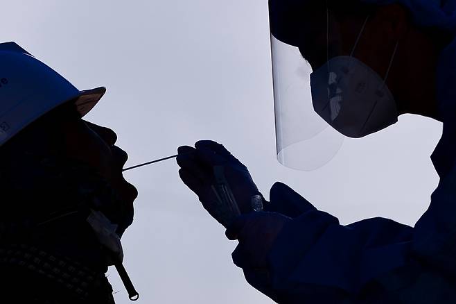 | ▲ 안전모 쓰고 코로나19 검사 지난 8월 25일 오후 서울 영등포구 경전철 신림선 1공구 공사 현장에 마련된 서울시 찾아가는 선별진료소에서 한 건설 노동자가 안전모를 착용한 채 신종 코로나바이러스 감염증(코로나19) 검사를 받고 있다. |