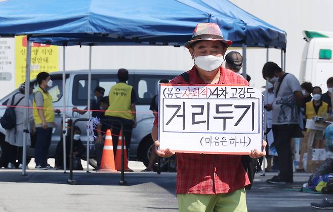 | ▲ 사회적 거리두기 4단계 동참 호소하는 시민 신종 코로나바이러스 감염증(코로나19) 4차 대유행으로 확진자가 급증하는 가운데 지난 7월 22일 서울 중구 서울역 광장에서 한 시민이 사회적 거리두기 4단계 동참을 호소하고 있다. |